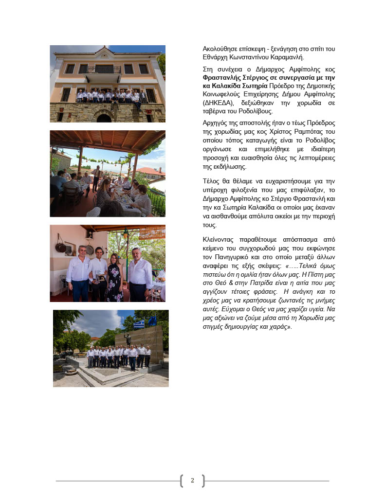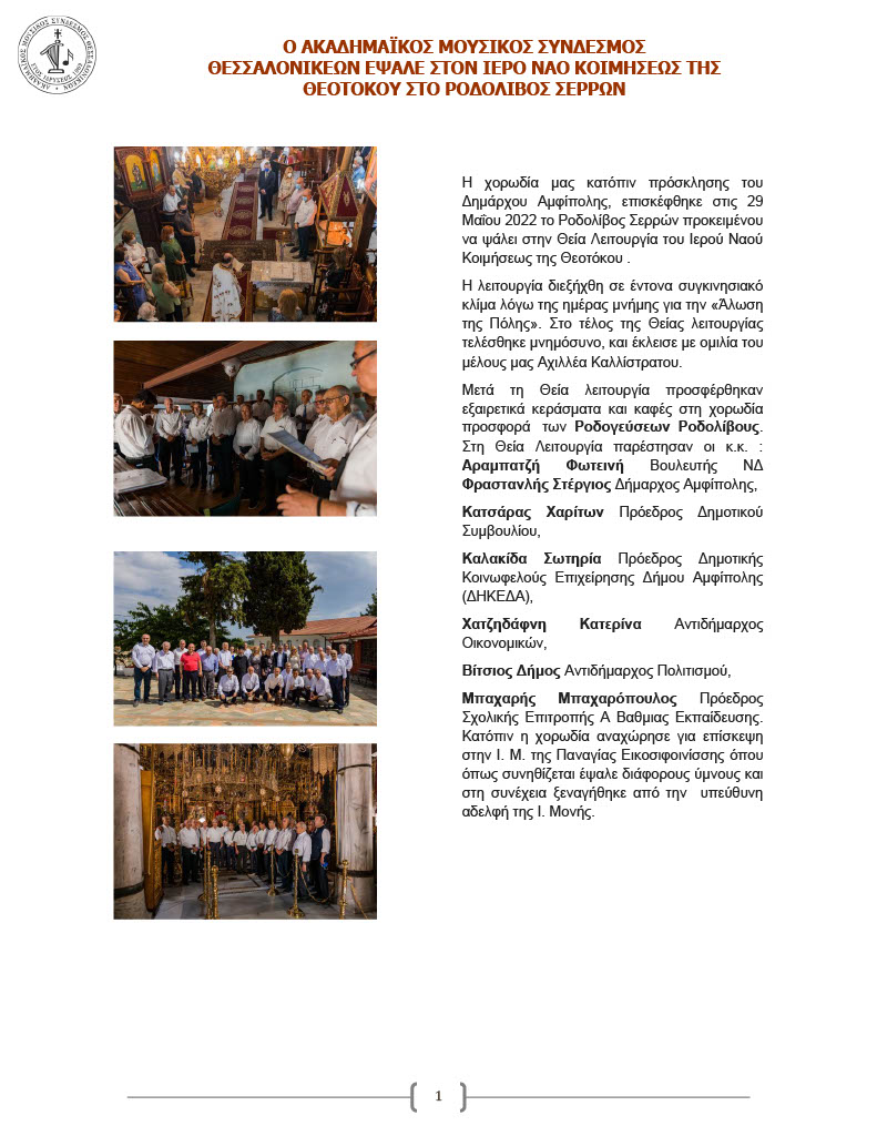 Η χορωδία μας κατόπιν πρόσκλησης του Δημάρχου Αμφίπολης, επισκέφθηκε στις 29 Μαΐου 2022 το Ροδολίβος Σερρών προκειμένου να ψάλει στην Θεία Λειτουργία του Ιερού Ναού Κοιμήσεως της Θεοτόκου .